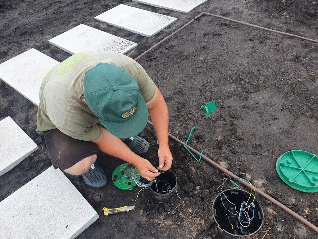 Система поливу починає монтуватися з моменту укладання ґрунту в рівень. Під доріжками під час їх будівництва прокладаються гільзи для проходу труб та проводки.