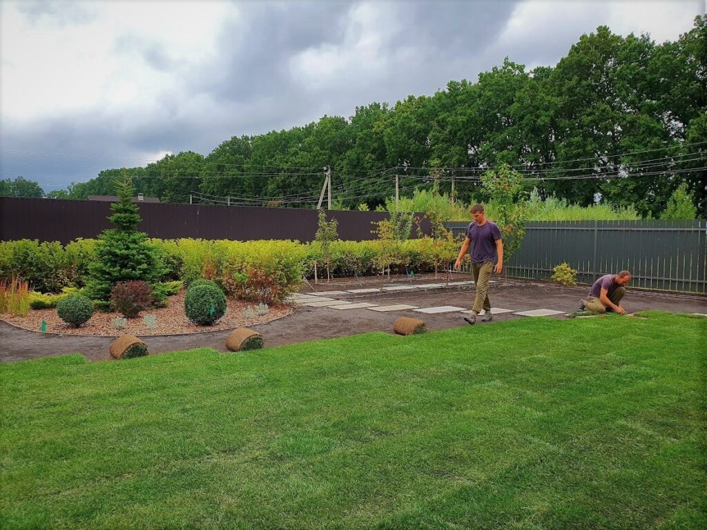 Після посадки рослин знову на ділянці вирівнюється ґрунт. На місцях укладання газону ґрунт вишкірюється в ідеальну площину та ущільнюється газонним катком.