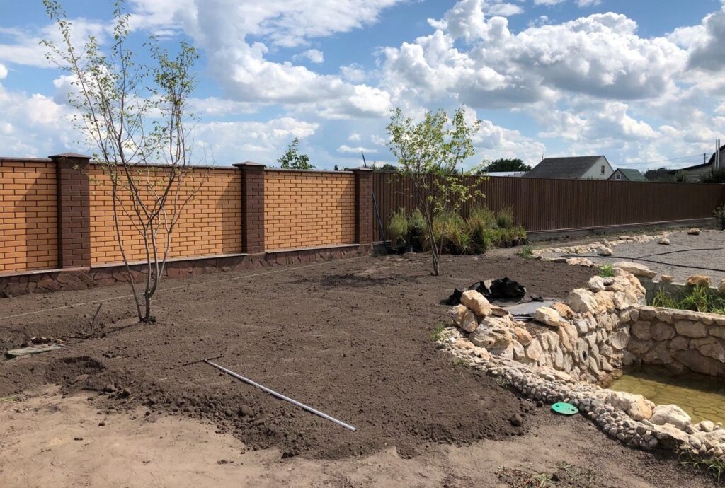 Потім територія вирівнюється – забирається зайвий ґрунт, знімається дернина, щільний ґрунт, формується корито для заповнення родючим шаром ґрунту.