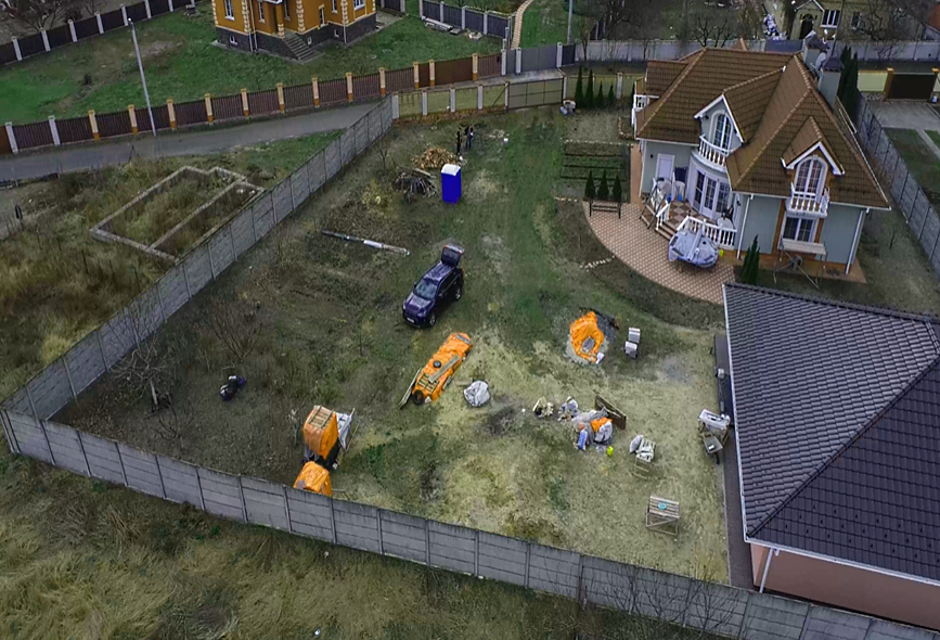 - Об’єкт виконаний із нуля. Особливістю цієї ділянки був великий перепад висот – майже 4 м. На території знаходилися три будівлі, збудовані на різних рівнях, і паркан, побудований по рельєфу. Основним побажанням замовника було обійтися без сходів.